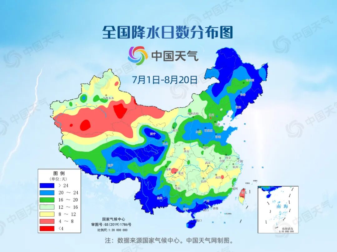 从全国降水日数分布图来看,四川盆地大部、湖北东部、湖南东北部和东南部、江西中部和北部、浙江南部、福建西北部等地的累计降水日数只有10天左右,其中四川盆地南部和江西东北部的部分地方累计降水日数不足8天。