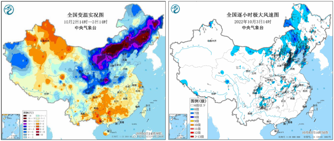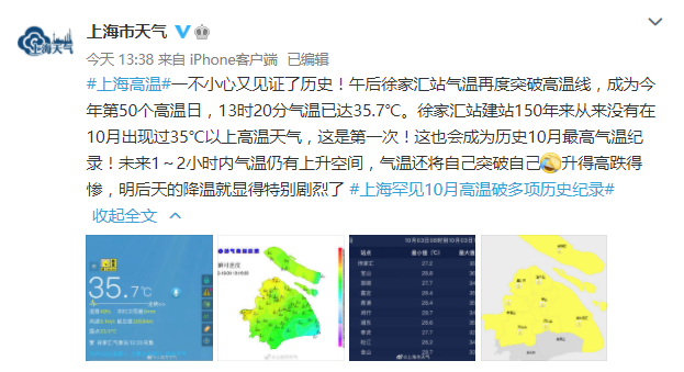 这个国庆假期,寒潮、高温罕见南北同台。今天高温进入鼎盛阶段,全国高温榜单前十均超过40℃,这样高的气温竟然出现在10月,简直难以置信。据上海市气象台消息,午后徐家汇站气温再度突破高温线,成为当地今年第50个高温日,13时20分气温已达35.7℃。徐家汇站建站150年来从来没有在10月出现过35℃以上高温天气,这是首次,也会成为当地历史10月最高气温纪录。不过,高温进入鼎盛时段的同时,寒潮扩大影响范围,今天白天已在北方制造强降温、大风天气。△冷到发黑的气温和密密麻麻的大风实况图。图:中央气象台预计,今夜寒潮将开始影响江淮等地,南方气温暴跌模式陆续开启,从“盛夏”的体感快速切换到“深秋”体感,后天高温将基本被终结。