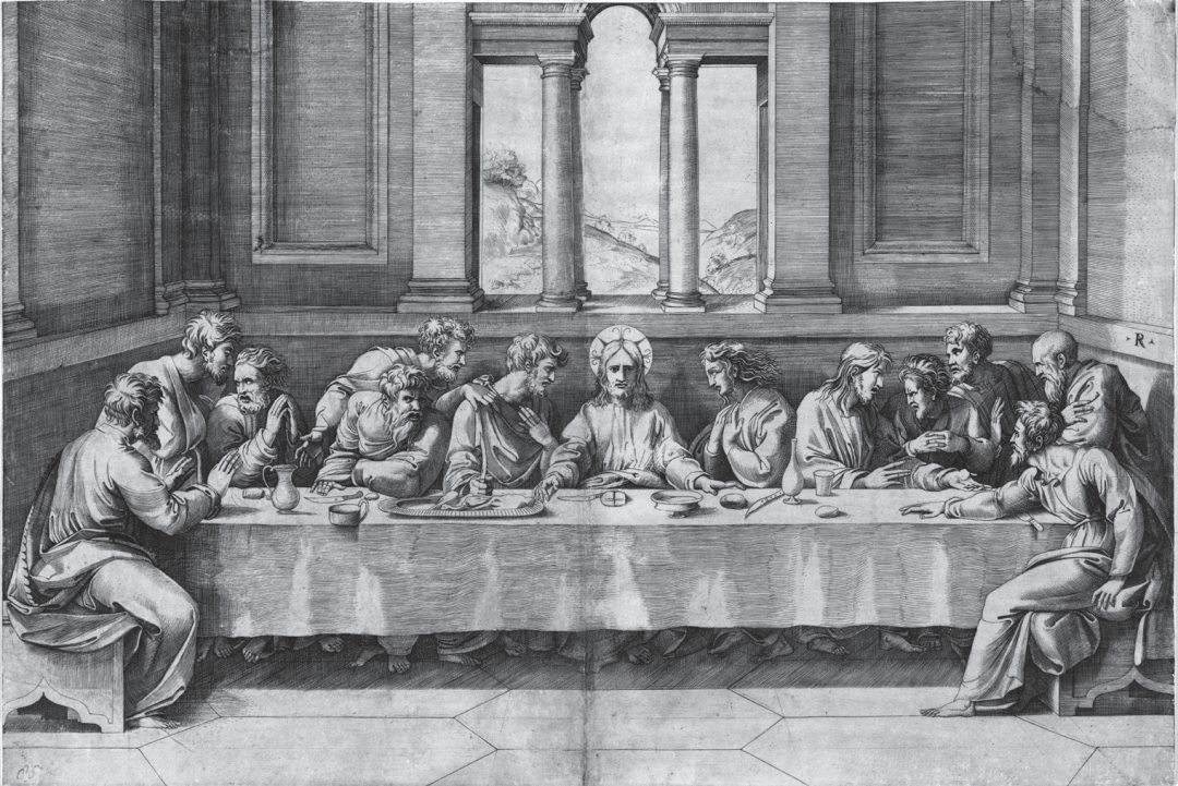 在这方面,只有拉斐尔理解达·芬奇。有一幅出自拉斐尔画派的《最后的晚餐》,由马尔坎托尼奥(Marcantonio Raimondi)镌刻成了版画。这幅画表现基督处于心理上相似的瞬间,他一动不动地凝视着前方,睁大眼睛望着画外。他的头部完全是垂直的,而且是画中唯一的正面像。