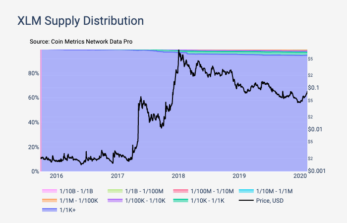 95%的XLM供应量由大户地址(至少占总供应量的1/1K)持有。这主要是因为恒星发展基金会(SDF)拥有XLM供应的一半以上,它目前拥有29.4B XLM。除此之外,SDF最近销毁了XLM总量的50%,使总供应量下降至50B。这些已销毁的XLM仍在链上显示,因为它们被送了一个销毁的地址上,因此被计为供应分配的一部分。