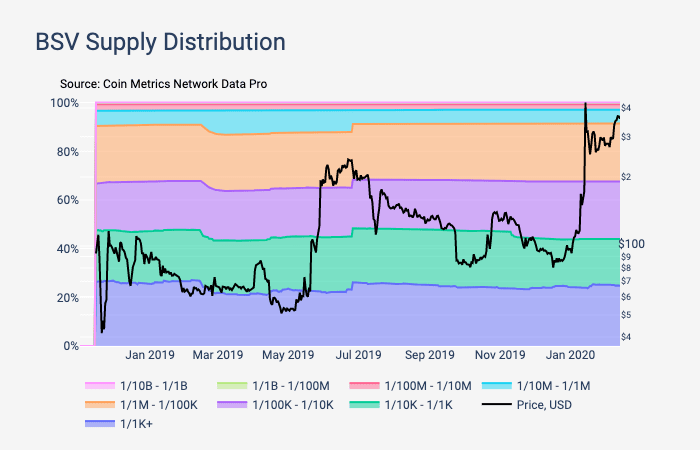持有BSV供应量的1/1K的大型地址占比一直相对持平,除了2019年2月的大幅下跌和2019年6月的突然增加这两次异动外。2018年8月,当BSV从BTC分叉时,这些大型地址约占BSV供应量的26%。截至2020年2月,它们持有约24%的占比。