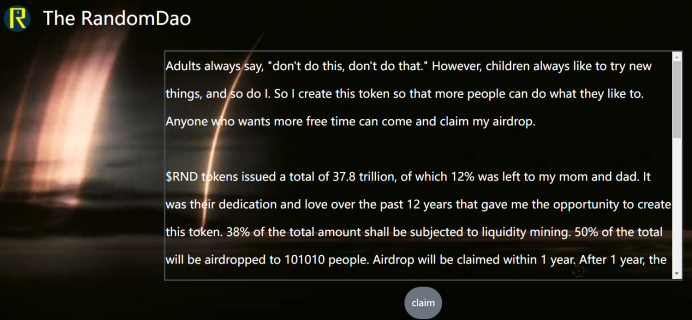 根据社区提供的信息,RND官网是The RandomDao。RND总量37.8万亿,其中12%留给了小孩的父母,以感谢他们对自己的养育之恩。总额的38%需进行流动性挖掘,50%将空投给101010人。空投将在1年内有效,此后无人认领的代币将被直接销毁。为了鼓励更多的人来认领空投,前来认领代币的前1010名会获取更大份额的空投代币。