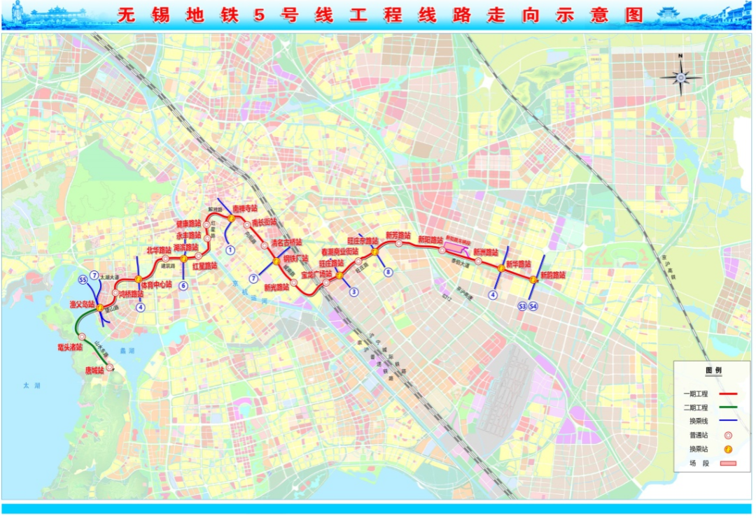 无锡地铁5号线一期工程起自渔父岛站,沿望山路、鸿桥路、太湖大道、建筑路、红星路、解放路、向阳路、城南路、旺庄路、泰伯大道敷设,止于新韵路站,路线全长约25.4公里。共设置车站22座,均为地下站。项目投资估算约为243.69亿元,建设工期约为64个月。