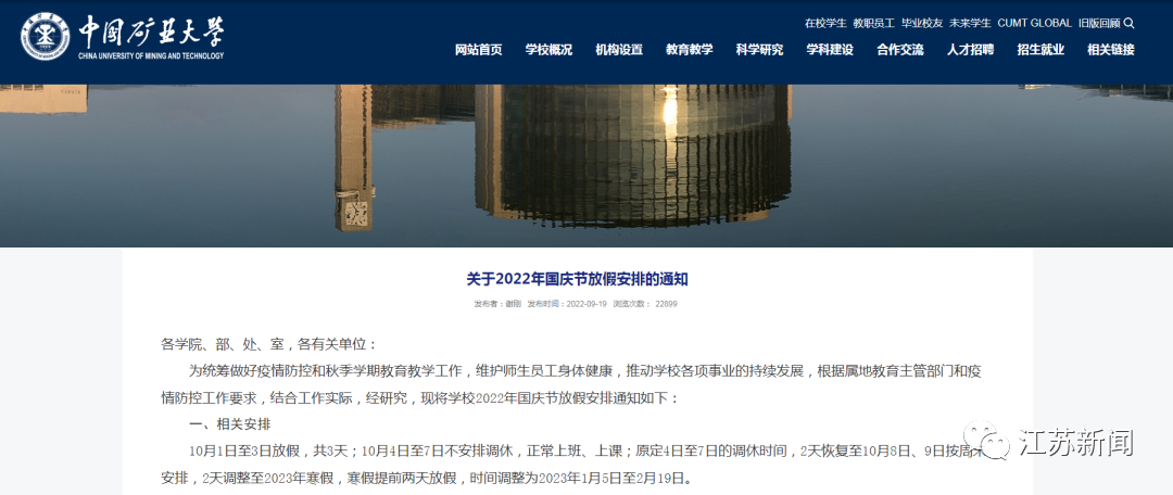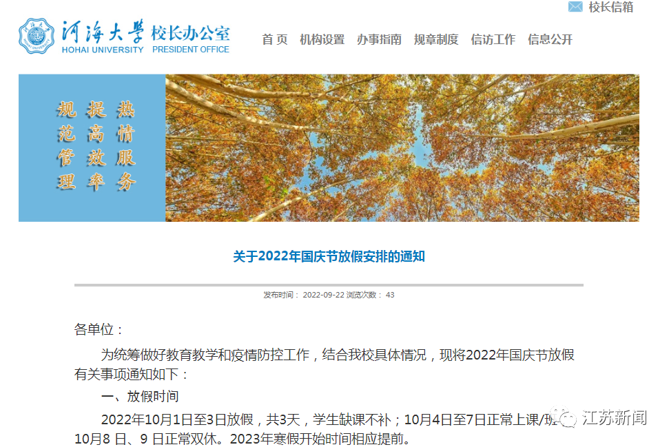 为统筹做好教育教学和疫情防控工作,经研究决定,2022年国庆节放假时间为10月1日至3日,共3天,学生缺课不补;10月4日至7日上课,10月8日、9日正常双休,课程照常进行。2023年寒假开始时间相应提前。
