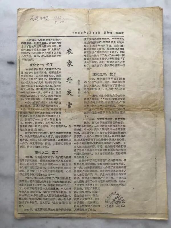 ▲1988年9月22日《人民日报》“改革开放十年”征文《农家“外交官”》中提到了无锡的莫惠英、平淑芳家庭