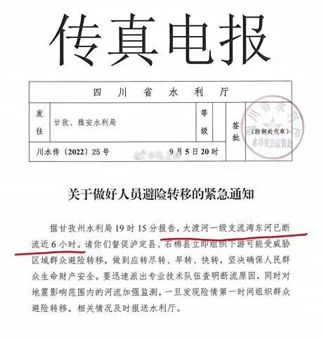 9月5日深夜,一份签发于9月5日20时的“关于做好人员避险转移的紧急通知”的传真电报在网上流传,文件称,“据甘孜州水利局19时15分报告,大渡河一级支流湾东河已断流近6小时。督促泸定县、石棉县立即组织下游可能受威胁区域群众避险转移……要迅速派出专业技术队伍查明断流原因,同时对地震影响范围内的河流加强监测,一旦发现险情第一时间组织群众避险转移。相关情况及时报送水利厅。”
