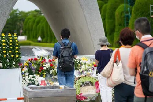 日本广岛市6日在该市的和平纪念公园举行遭原子弹轰炸77周年纪念活动。包括日本首相岸田文雄、联合国秘书长古特雷斯在内的3200余人出席了纪念仪式。图为人们在日本广岛和平纪念公园的和平都市纪念碑前献花。