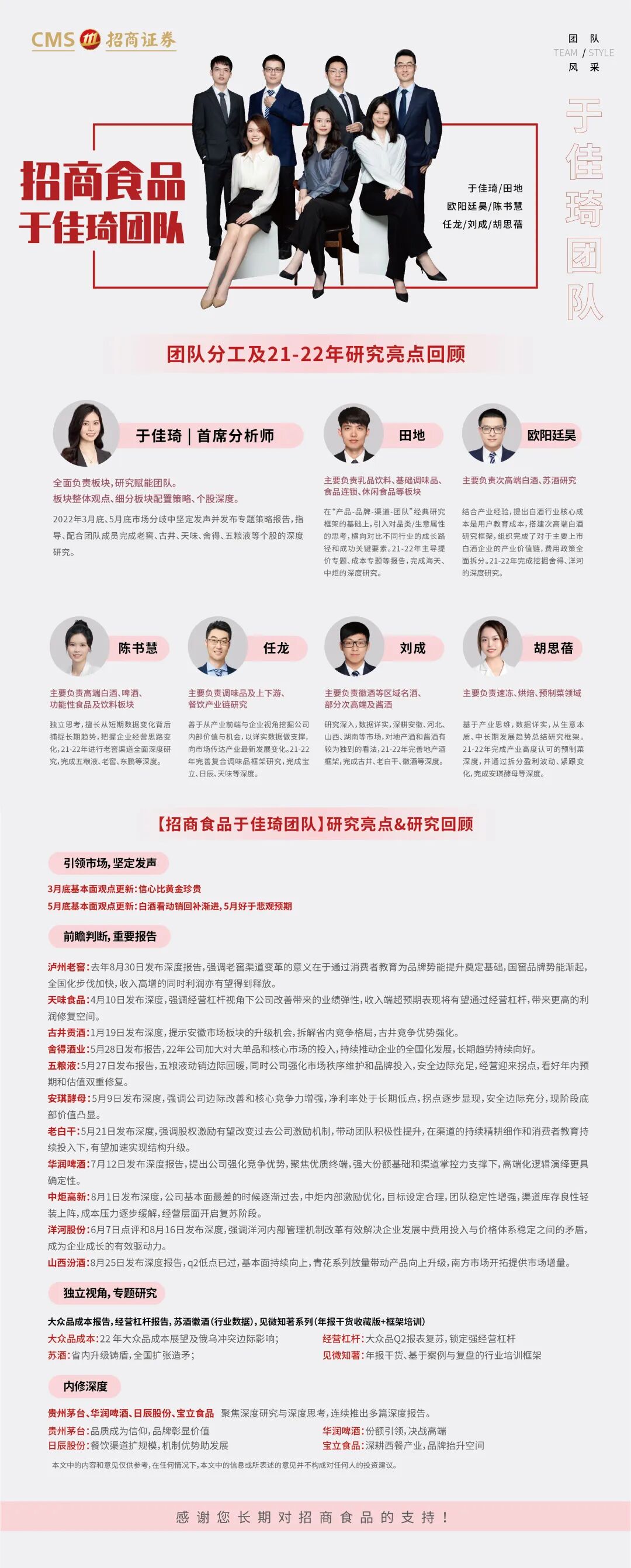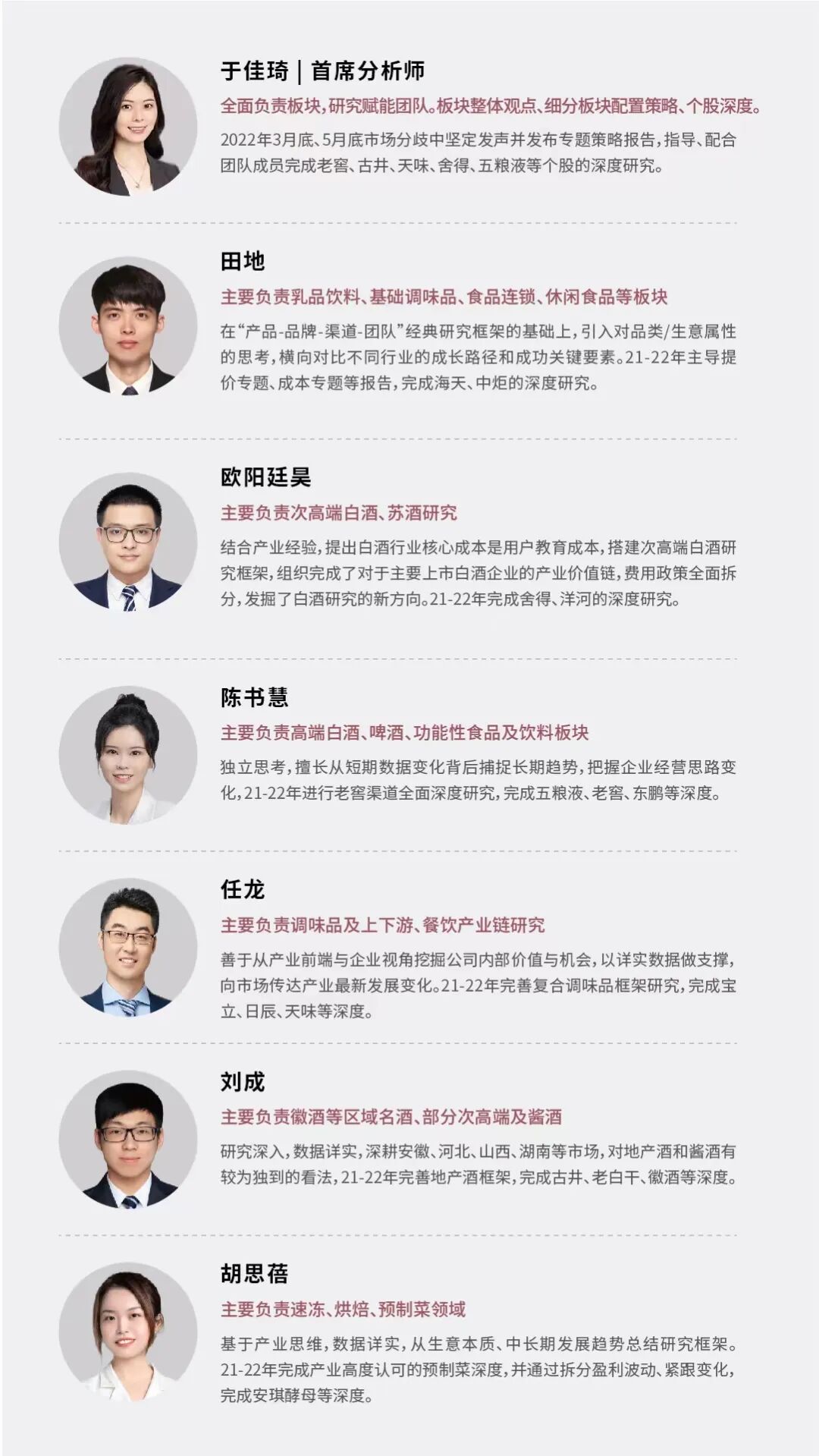 于佳琦:食品饮料首席分析师,南开大学本科,上海交通大学硕士,CPA,16 年就职安信证券,17 年加入招商证券食品饮料团队,6 年消费品研究经验。