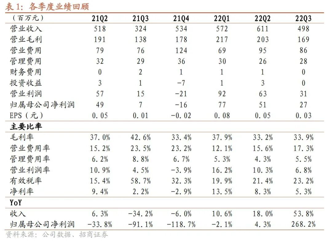 Q3收入/归母净利润分别同比+53.77%/+269.18%,其中调味品主业同比+67.8%,收入大幅增长,主要在于低基数下公司改革效果逐步体现。22年公司继续改革投入,将更加重视多渠道与多品类的发展。当前看公司处于改革深化阶段,醋酒酱三主业发展策略初见成效。阶段性费用投入以及产能扩张对盈利有所影响,但也印证了公司对于自身长远发展的信心。我们认为公司盈利端压力或延续到年底,但同时也建议更加关注改革驱动下品类多元化的发展,以及全国化的加速布局,带动规模的提升,期待盈利修复业绩改善。我们给予22-24年EPS分别为0.17、0.28、0.38元,对应22-23年估值分别为62X、37X,维持“强烈推荐”评级。Q3收入/归母净利润分别同比+53.77%/+269.18%。公司前三季度实现收入16.82亿元,同比+23.71%,归母净利润1.54亿元,同比+14.70%,扣非归母净利润1.40亿元,同比+23.61%。其中,公司Q3收入4.98亿,同比+53.77%,归母净利润2653万元,同比+268.18%,归母扣非净利润2300万元,相比去年同期扭亏为盈。公司Q3现金回款6.22亿元,同比+53.0%,与收入增速持平,经营性净现金流-0.22亿,同比增加0.39亿,合同负债0.34亿,同比基本持平,环比略有下降。