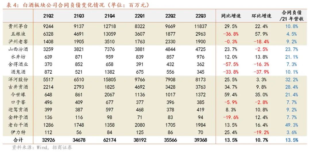 蓄水池充裕,全年任务完成确定性较高。Q3白酒企业预收款明显增长,行业合同负债同比+13.5%,环比+10.7%,蓄水池余留充裕,对全年目标的完成形成较强支撑。具体来看,茅台合同负债环比增加21.7亿,同比去年同期增加27亿,经营节奏从容不迫的同时增长潜力仍然十足。五粮液合同负债环比改善,环比H1末增加10.9亿。洋河、古井、水井坊、今世缘、迎驾、老白干均实现环比、同比加速增长,与渠道反馈的回款速度快相匹配,同时也彰显了公司在渠道精细化运作方面的积极作为。舍得、酒鬼等公司合同负债同比、环比出现下降主因积极消化渠道库存,帮助渠道调整,为来年高速增长蓄力。