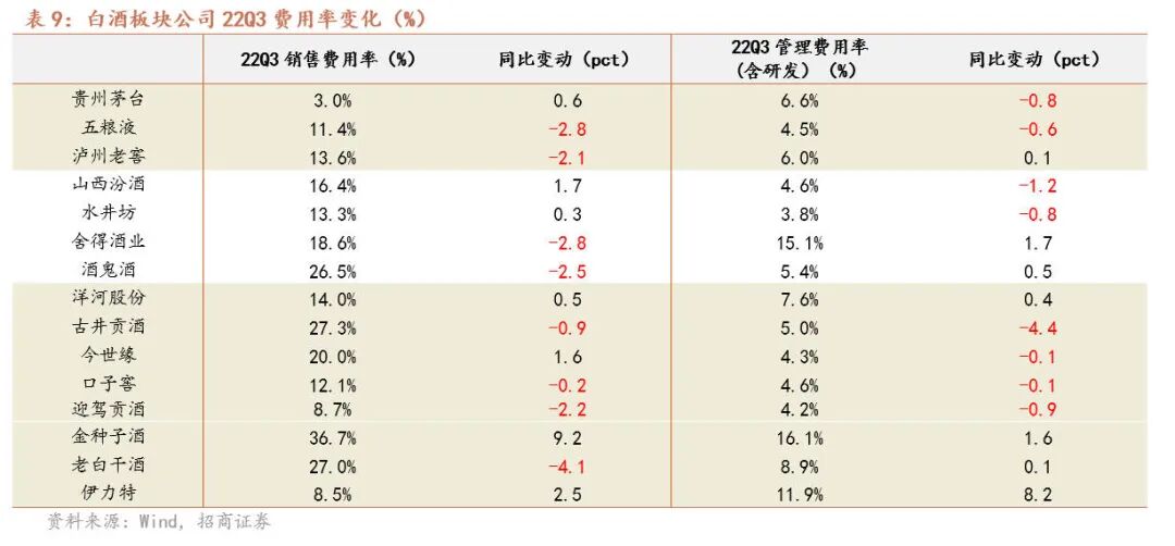 疫情影响旺季销售费用投放呈现分化,管理费用率基本平稳。酒企旺季费用投放受疫情影响节奏及力度不同,高端酒中五泸受制疫情费用投入减少,叠加规模效应摊薄销售费用率,茅台由于营销改革销售费用率提升约0.6pct,次高端中舍得、酒鬼下降分别由于兑付节奏及同期高基数导致,汾酒加大费用投入和促销力度推动销售费用率同比增加1.7pct。区域酒中古井、口子、迎驾、老白干销售费用率下降,分别下降0.9pct、0.2pct、2.2pct、4.1pct,与公司精准管控费用投入,提升经营效率有关,其余酒企费用率有所提升与促销投放增加有关。板块管理+研发费用率整体维持平稳略降态势,主要因受益规模增长形成一定摊薄。