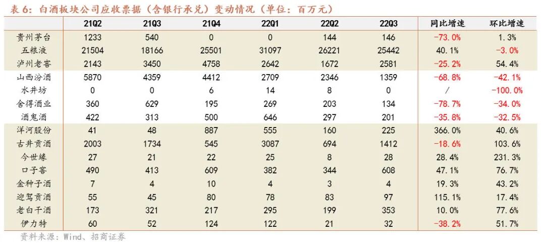 白酒板块:经营稳健韧性凸显,业绩表现亮眼,22Q3环比加速增长。2022年Q3白酒行业收入和净利润同比增速分别为+18.3%/+21.6%,旺季环比增速提升明显,业绩表现亮眼。分价格带看,高端白酒经营持续稳健,茅台渠道改革继续推进,五粮液市场培育动作逐步显现,老窖高增趋势延续。次高端Q3重回快速增长,品牌势能向上,其中汾酒Q3利润增速超预期,三季度旺销得到验证,舍得在Q2去库存后,Q3营收和现金流实现较好增长,酒鬼、水井坊经营稳健,平稳过渡。区域龙头精耕细作成效兑现,龙头企业增长多超预期,古井预收款余留充裕,洋河改革成效显著推动利润超预期增长,老白干收入利润高增同时预收款环比仍有提升。从合同负债看,茅台合同负债环比同比均大幅增加,增长潜力仍足,洋河、古井、水井坊、今世缘、迎驾、老白干均实现环比、同比的加速增长,凸显企业经营韧性,全年任务完成确定强。
