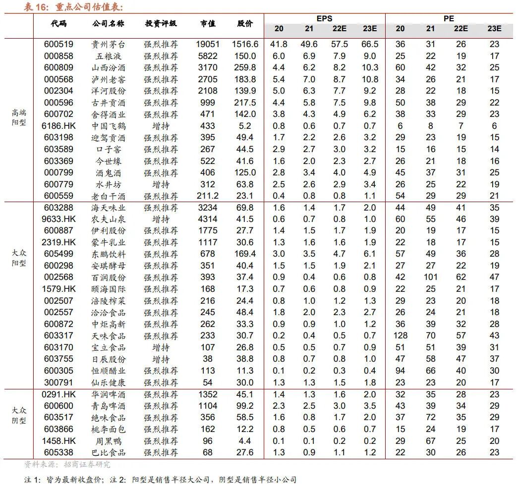投资建议:白酒价值底部等待催化,降低预期后安全边际更具备。10月板块回撤较多是多地疫情反复、各方面政策博弈、春节预期谨慎等多种因素短期发酵所致,但我们从白酒企业的三季报可以看到其基本面维持稳定。春节由于基数问题,可能会导致投资者有一定担忧,但是预期足够低也同时是安全边际的来源。我们相信企业也会积极作为,来应对行业压力。从估值和收益维度看,节后的一波剧烈回调后白酒板块估值已处于极低水平,政策和基本面的足够低预期也形成较强的安全边际,建议逢低布局。食品板块整体以优选α标的为主,关注后续成本回落及费用优化释放的业绩弹性。