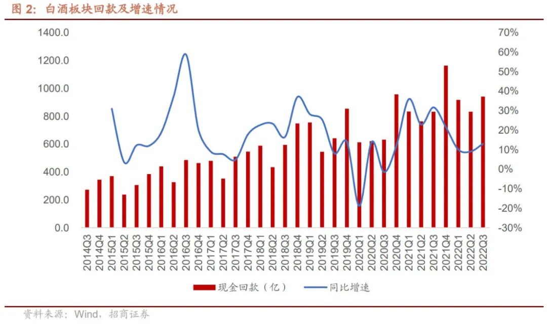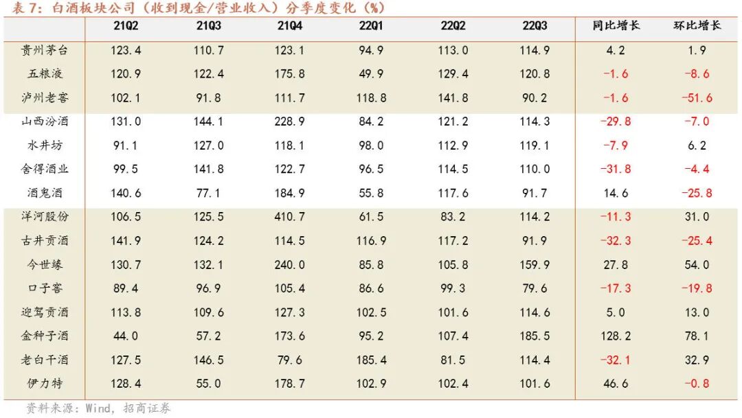 白酒板块22Q3稳健增长,业绩表现亮眼,22Q3增速环比提升明显。2022年Q3白酒行业营收831亿元,同比+18.3%,净利润299亿元,同比+21.6%,环比增速提升明显,业绩表现亮眼。2022年Q3现金回款941亿,同比+13%,回款低于收入增长。
