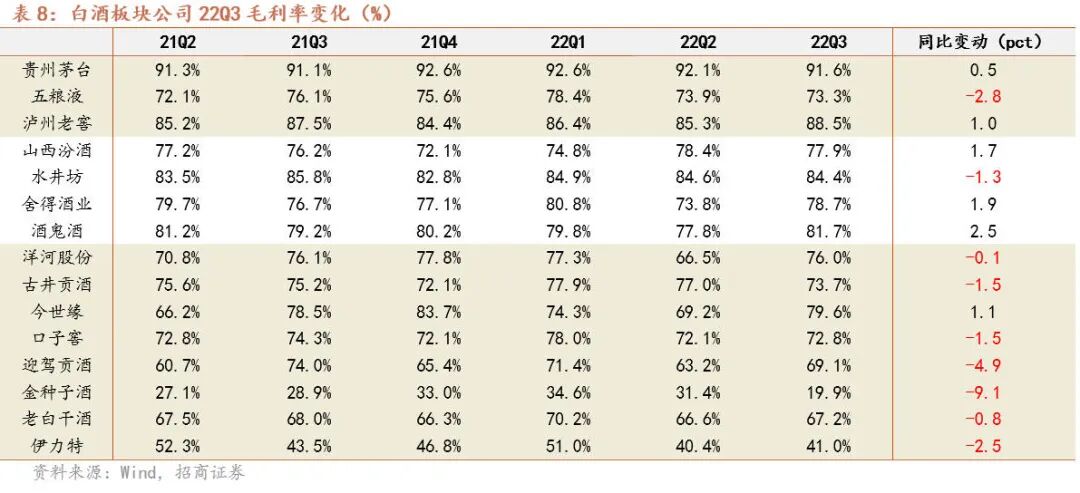 区域精耕细作成效兑现,龙头企业增长多超预期。古井Q3利润虽略低于预期但预收款充裕,全年任务完成难度低,渠道库存延续良性态势,市场动销情况良好推动品牌势能不断提升。洋河Q3利润增速+40.4%,超市场预期,数字化改革成效显著推动费用投放效率改善。老白干Q3收入超预期增长,利润实现高增的同时预收款环比提升,疫情下凸显自身经营韧性和区域精耕细作成效。