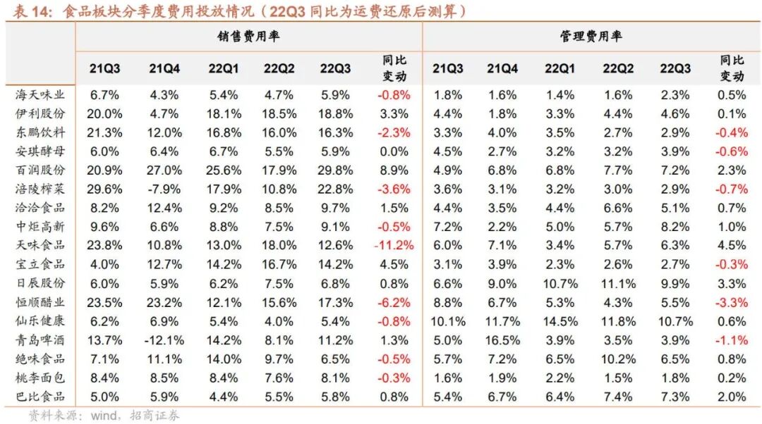 费用投放表现分化,部分标的高基数下弹性明显。疫情反复及成本压力下,大众品公司费用策略表现分化,调味品龙头海天中炬严格管控,销售费用率略有下降,东鹏受益规模效应费率摊薄,恒顺、天味、榨菜等去年同期广告宣传投入力度大,高基数下费用率下降明显。但也有公司在疫情逆势加大费用投放,伊利销售费用率增加主要系三季度综艺费用确认增加以及澳优并表贡献,青啤旺季加大费用投入,洽洽双节期间加大坚果及品牌费用投放,百润上半年推广活动延迟到三季度,销售费用率同比均有明显增加。