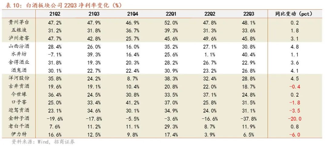 高端盈利能力稳中有升,次高端增幅明显,区域酒呈现分化。从归母净利率来看,高端酒产品结构稳步提升叠加费率优化,净利率稳中有升,茅五泸净利率分别同比+0.2/1.8/3.1pct。次高端盈利能力增幅明显,主因产品结构升级加速及相关费用投入受疫情及投放节奏影响减少导致,贡献较大业绩弹性。区域龙头呈现分化,洋河受益自身改革费用投放效率显著改善净利率,老白干、今世缘也实现小幅正增长,其余酒企受疫情等因素扰动仍处调整阶段,盈利能力略下滑。