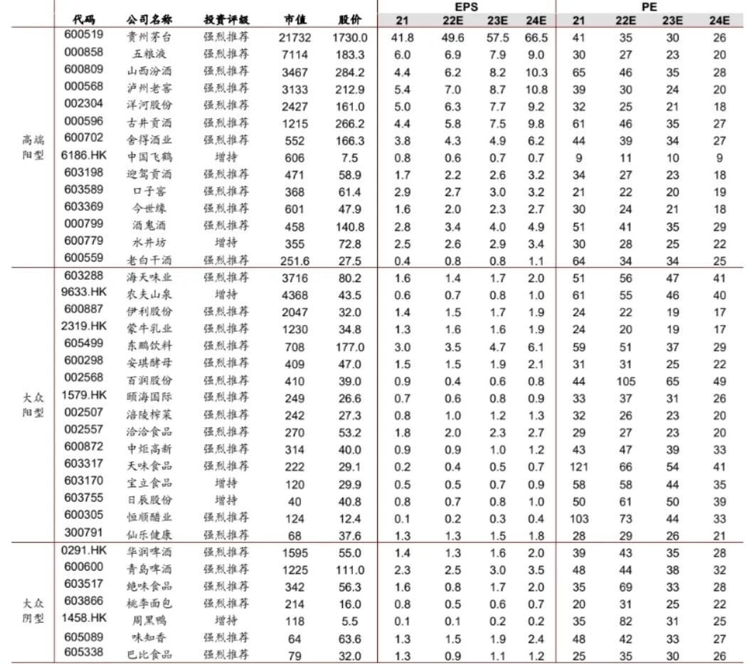 第一阶段:压力普遍较大,首选业绩稳定的高端白酒(茅五泸)以及基数不高、成本有望下降的啤酒(青啤、华润)、饮料(东鹏)、调味品(海天、中炬);