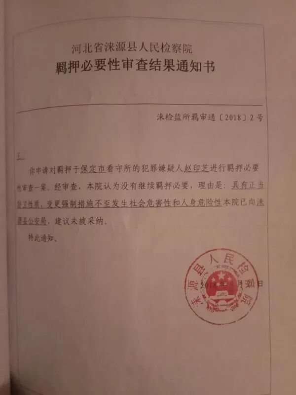 小菲告诉北京青年报记者,家里向当地司法局申请了法律援助,向检察院提交父母取保候审的申请,涞源县人民检察院也向来源警方发出《对犯罪嫌疑人、被告人变更强制措施(予以释放)建议书》。检察院认为不需要继续羁押赵印芝,因其行为具有正当防卫性质,变更强制措施不至发生社会危害性和人身危险性。