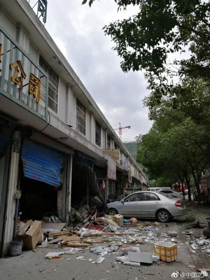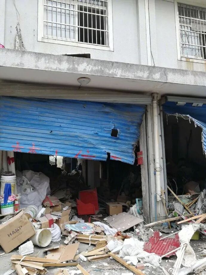 另据@中国之声 消息,记者在现场附近看到,现场拉起了警戒线,清理工作正在进行中,受到爆炸波及,附近建筑的玻璃,卷帘门均受损,有的房子墙体被震穿一个洞。
