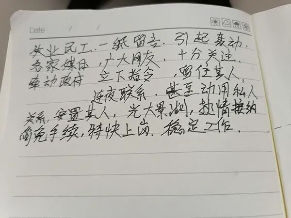“写作我就不行。我现在很想写作。但是写不出来。”他正想给媒体和网友写个感谢信,这么说着,给记者看一个没写完的提纲,是四字断句的格式。
