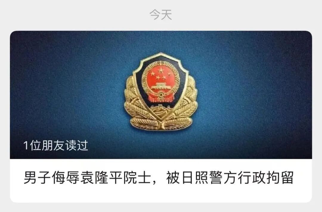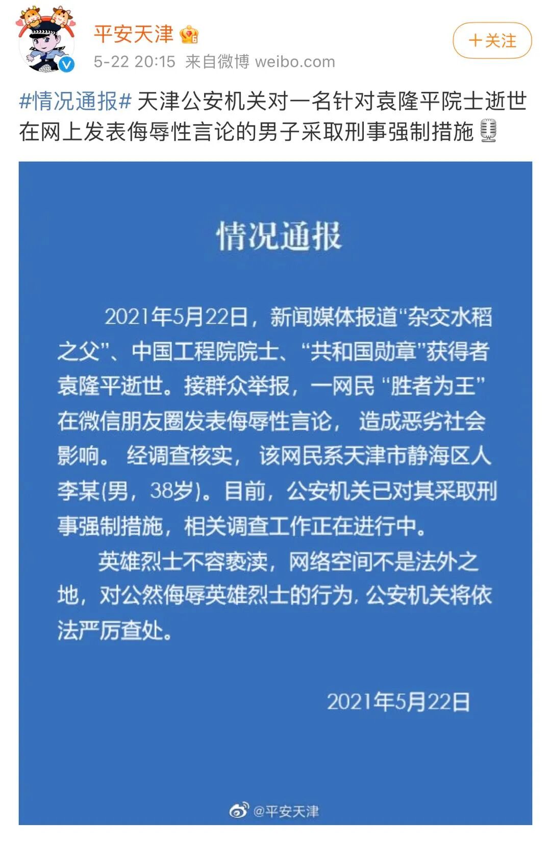 22日23时许,据@平安北京,5月22日13时07分,“杂交水稻之父”、中国工程院院士、“共和国勋章”获得者袁隆平逝世,在全国人民深切哀悼之时,微信用户“南望山下”在微信群发布多条侮辱袁隆平院士的言论,造成恶劣影响。15时41分警方接举报后,迅速开展工作,于当日21时许将该人查获。目前,该人已被朝阳公安分局依法刑事拘留,案件正在进一步工作中。22日20时许,据@平安天津,天津公安机关对一名针对袁隆平院士逝世在网上发表侮辱性言论的男子采取刑事强制措施。接群众举报,一网民“胜者为王”,天津市静海区人,在微信朋友圈发表了侮辱性言论,造成恶劣社会影响。目前,公安机关已对其采取刑事强制措施,相关调查工作正在进行中。对两位院士逝世发布侮辱性言论