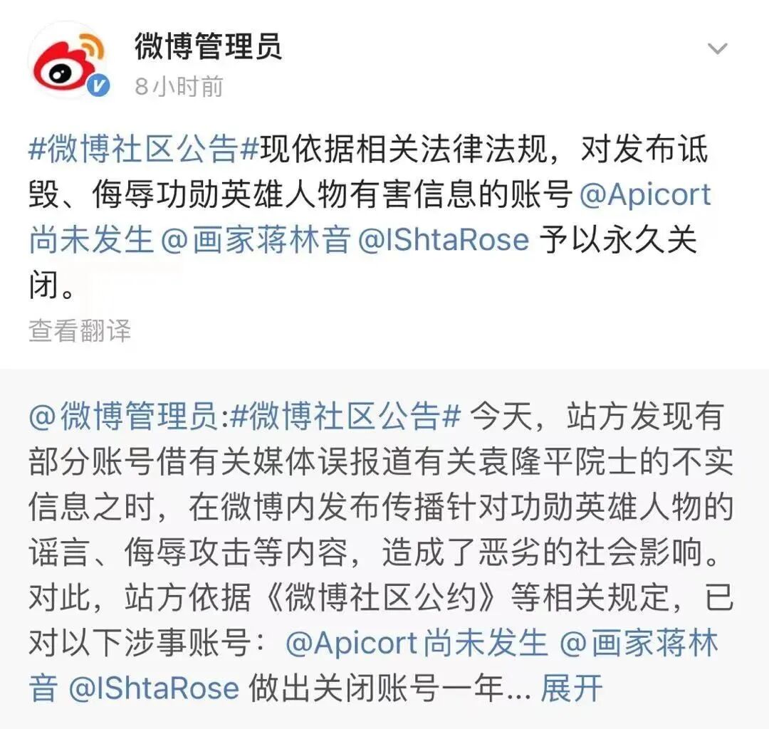 23日12时许,@微博管理员 称,现依据相关法律法规,对发布诋毁、侮辱功勋英雄人物有害信息的账号@Apicort尚未发生@画家蒋林音@IShtaRose 予以永久关闭。(→此前报道)(本文综合@平安北京、@平安天津、@金湖公安、@厦门警方在线、微信公众号日照公安、@微博管理员)