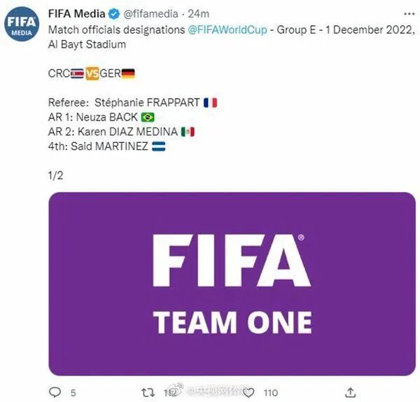 FIFA官方宣布哥斯达黎加VS德国的裁判组信息,