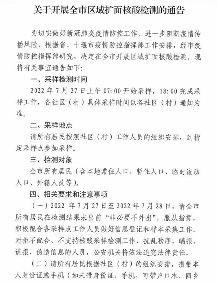 为切实做好新冠肺炎疫情防控工作,严密排查可能存在的疫情风险,经竹山县新冠肺炎疫情防控指挥部研究,决定在全县范围内开展全员核酸检测。现将有关事宜通告如下:7月27日06:00开始采样,7月27日13:00完成采样工作,各社区(村)具体采样时间以各社区(村)通知为准。请所有居民按照社区(村)工作人员的组织安排,到指定采样点参加采样。竹山辖区所有居民(含本地常住人口、暂住人口、临时流动人口、外籍人员等)。(一)2022年7月27日,请竹山辖区内所有居民在检测结果未出前“非必要不外出”,服从指挥,积极配合各采样点工作人员做好信息登记和样本采集工作。对拒不配合、不支持核酸采样检测工作,扰乱秩序、瞒报、谎报、伪造信息的人员,公安机关将依法追究法律责任。(二)请所有居民根据社区(村)组织安排,携带本人身份证、户口本、回乡证、台胞证、护照等有效身份证件原件(择一即可),提前扫码登记信息,有序前往指定采样点进行采样,确保不漏一户一人。(三)请全体人员在采样期间做好个人防护,全程佩戴口罩,有序排队,并保持两米以上距离,避免聚集和相互交谈。根据新冠肺炎疫情防控工作需要,为切实保障人民群众身体健康和生命安全,按照全市疫情防控工作统一安排,县疫情防控指挥部决定在全县范围内全员核酸检测。现将有关事项通告如下:7月27日全天,各乡镇(社区)具体采样时间以各乡镇(社区)通知为准。在全县内工作、生活、学习的所有人员(包括常住人口、暂住人口、临时流动人口等),根据所在乡镇(社区)公布的采样点,分批次、分时段有序参加核酸采样。外地来溪人员就近参加当地核酸采样。1.请市民朋友不必恐慌,保持正常的工作和生活秩序。2.请市民朋友积极配合,不拍照录像,不信谣不传谣,以免造成不良社会影响。3.请市民根据乡镇(社区)、网格员、网格小组长的组织安排,携带身份证,分时段有序前往指定采样点进行核酸采样,确保不漏一户一人。4.请市民在参加采样期间做好个人防护,全程佩戴口罩,主动接受体温检测,并保持一米以上间距,不交谈、不聚集,服从现场工作人员指挥,切实防止采样时交叉感染。5.接种新冠病毒疫苗不超过 48 小时的市民,向居住地所在乡镇(社区)、村报备后,不参加本次核酸检测。6.市民朋友核酸采样后,须在采样点领取《竹溪县核酸采样证明》。7.请广大市民注意出行安全,照顾好老人、孩子,采样完成后请及时有序离开。为了您和全县人民群众的健康安全,请各位市民朋友支持配合区域扩面核酸检测工作,务必在采样检测点关闭前到点检测,做到应检尽检。无正当理由拒不配合,妨碍疫情防控或造成其他严重后果的,将依法承担相应的法律责任。为切实做好新冠肺炎疫情防控工作,更好地保障广大人民群众身体健康和生命安全。按照省市疫情防控工作安排,经研究,决定在我县县域内开展全员核酸检测。现将有关事项公告如下:1.7月27日上午7时开始在全县范围内开展核酸检测,下午7时结束。2.凡长期居住和临时居住在我县县域内的居民以及在我县工作、就学等人员均应接受核酸检测。(一)请遵照村委会(社区)通知要求,携带身份证(户口本)、手机、口罩,分时段有序到场参加核酸检测,全程佩戴口罩,保持 1 米人员间隔,积极配合医务人员和工作人员。(二)全体居民要自觉履行法律义务,配合支持新冠病毒核酸检测工作。对干扰、阻碍核酸采样工作的,依法追究责任。(三)采样全程请勿随意拍照、摄像,请勿上传至网络、微博、朋友圈,以免引起不必要的恐慌。(四)请广大居民注意出行安全和排队秩序,照顾好随行采样的老人、孕妇、小孩等特殊人员,注意防范高温天气。根据新冠肺炎疫情防控工作需要,为切实保障人民群众身体健康和生命安全,按照省、市疫情防控工作统一安排,武当山特区疫情防控指挥部决定在全区范围内开展区域扩面核酸检测。现将有关事项通告如下:在武当山特区辖区内所有人员(包括常住人口、暂住人口、临时流动人口等),根据所在村(社区)公布的采样点,分批次、分时段有序参加核酸采样。外地来武人员就近参加当地核酸采样。2.请积极配合,不拍照录像,不信谣不传谣,以免造成不良社会影响。 3.请根据社区(村)、网格员、网格小组长的组织安排, 携带身份证,分时段有序前往指定采样点进行核酸采样,确保不漏一户一人。4.请在参加采样期间做好个人防护,全程佩戴口罩,主动接受体温检测,并保持一米以上间距,不交谈、不聚集,服从现场工作人员指挥。 5.接种新冠病毒疫苗不超过48小时的,向居住地所在社区、村报备后,不参加本次核酸检测。6.市民朋友核酸采样后,须在采样点领取《武当山特区核酸采样证明》;7月27日持《武当山特区核酸采样证明》在武当山辖区小区、单位等公共场所出行。7.采样期间,注意出行安全,照顾好老人、孩子,采样完成后请及时有序离开。 为了您和全区人民群众的健康安全,请广大居民和游客朋友支持配合本次区域全员核酸检测工作,务必在采样检测点关闭前到点检测,做到应检尽检。无正当理由拒不配合,妨碍疫情防控或造成其他严重后果的,将依法承担相应的法律责任。为切实做好新冠肺炎疫情防控工作,严密排查可能存在的疫情风险,根据省市疫情防控工作安排部署,经区新冠肺炎疫情防控指挥部研究,决定在全区范围内开展区域核酸检测。现将有关