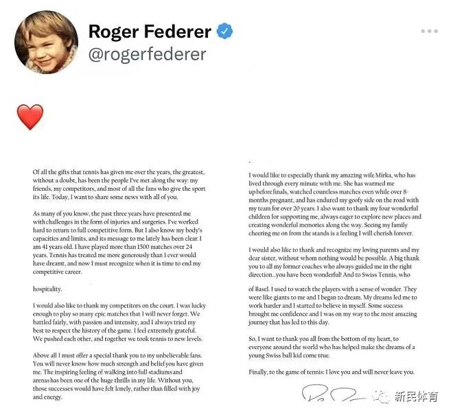 这是一场事先张扬的退役,天王的退役。北京时间昨天晚上,网坛巨星费德勒在个人社交媒体上宣布,下周在伦敦进行的拉沃尔杯赛事,将会是自己最后一次参加职业巡回赛的比赛。