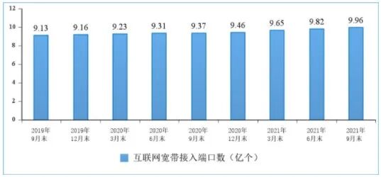 宽带网络建设稳步推进。截至9月份末,全国互联网宽带接入端口数量达9.96亿个,同比增长6.3%,比上年末净增4963万个。其中,光纤接入(FTTH/O)端口达到9.34亿个,比上年末净增5421万个,占比由上年末的93%提升到93.8%。