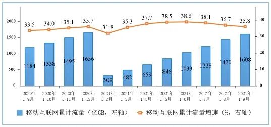 图5 2020-2021年1—9月份移动互联网累计接入流量及增速情况