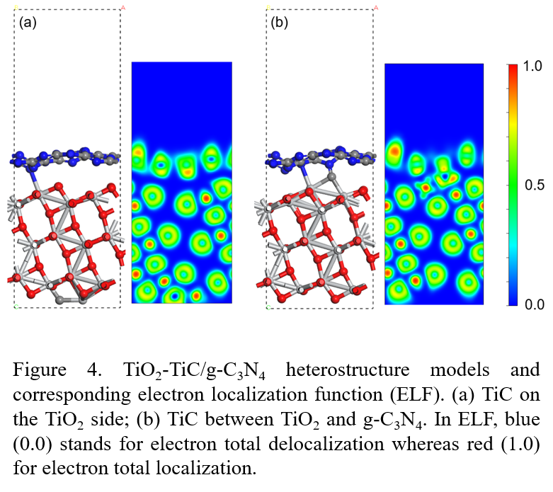随后,通过DFT计算表征了TiO2-TiC/g-C3N4的异质结构、化学相互作用和电荷转移。态密度分析证实了TiC是一种优良的导体。电子定位函数(ELF)表明当TiC位于TiO2和g-C3N4之间时,TiO2-TiC/g-C3N4存在一定程度的共价键。此外,通过Bader电荷差分析分析电子转移,从而证明了TiO2-TiC/g-C3N4为Z型异质结。通过UV-vis漫反射吸收、自旋密度和过剩电子迁移能的计算,进一步验证了TiC在体系中的重要性。最后,通过实验及理论计算,得出可能的反应机理。