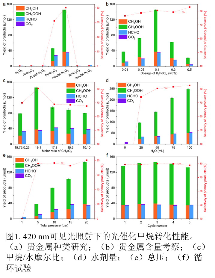 亮点一:在可见光照射下,甲烷直接转化制碳一含氧化合物的产率达到近100 μmol·h-1,初级产物(CH3OH和CH3OOH)的选择性高达82.5%;