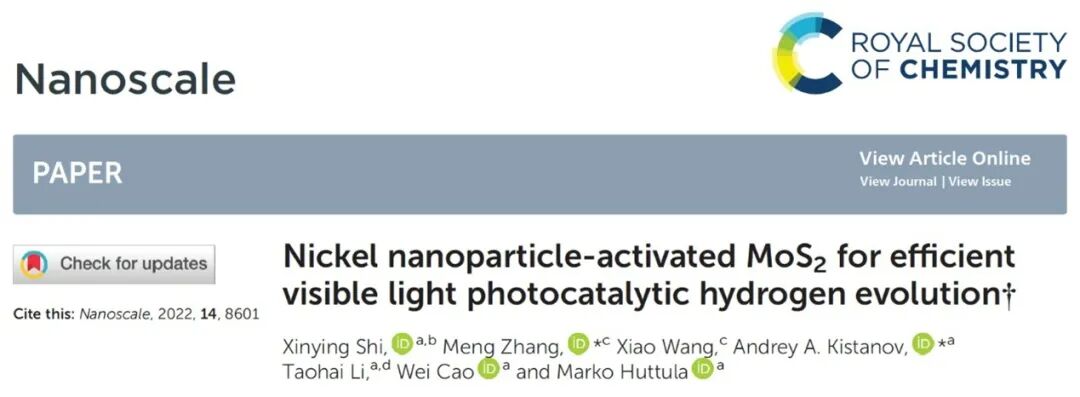 https://www.researchgate.net/profile/Xinying-Shi-2Xinying Shi, Meng Zhang*, Xiao Wang, Andrey A. Kistanov*, Taohai Li, Wei Cao, Marko Huttula. Nickel nanoparticle-activated MoS2 for efficient visible light photocatalytic hydrogen evolution. Nanoscale, 2022, 14, 8601−8610.
