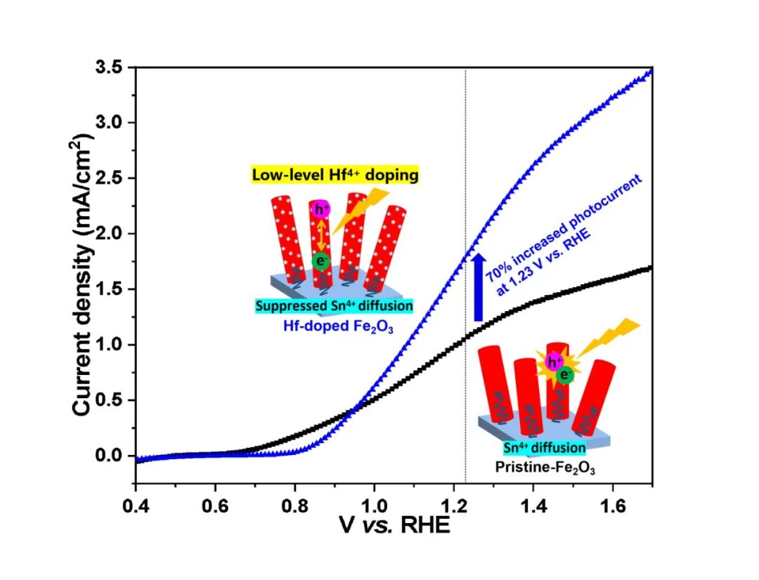 首先在FTO基底上生长Hf掺杂的β-FeOOH纳米棒阵列,接着采用高温(800°C)退火将Hf掺杂的β-FeOOH纳米棒转化为Hf掺杂的α-Fe2O3纳米棒,伴随着来自FTO基底的Sn的自掺杂。![]()