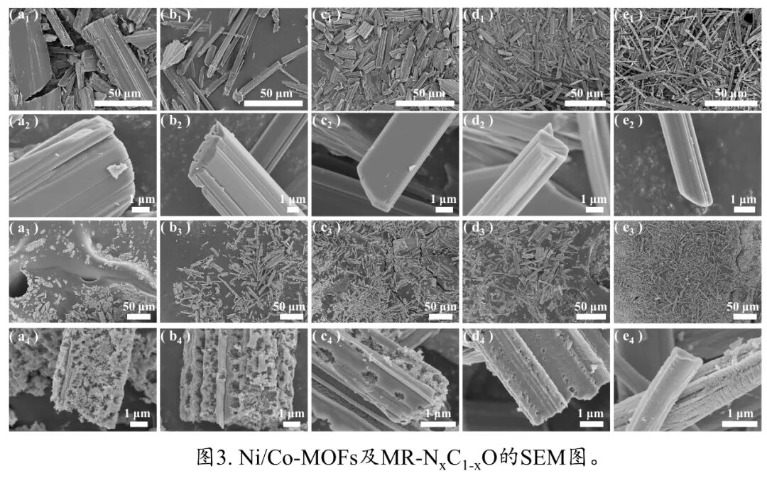 通过SEM可以发现,随着Ni比例的提升,其MOFs的棒状形貌纵横比发生了明显的变化。将其煅烧后,Ni-Co-O固溶体展现了明显的分级多孔结构特征,利用MOFs有机成分的挥发造孔使得固溶体暴露了更多的反应活性位点,良好地体现了制备工艺的优越性。![]()