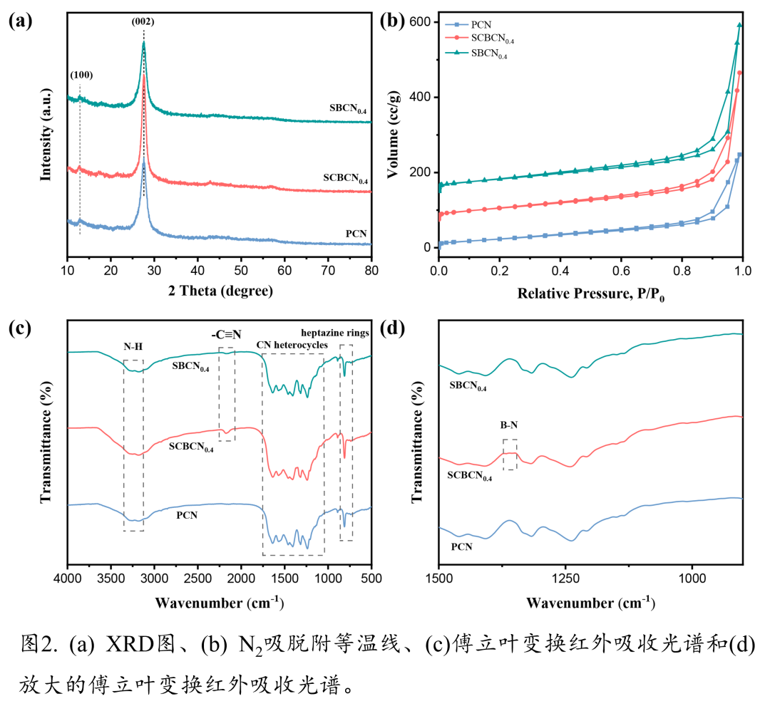 XRD图像检测出氮化碳的两种典型衍射峰。且NaBH3CN后改性的SCBCN0.4具有改善的面内堆积和层间堆积,而这有利于电子的层间垂直传输。N2吸脱附等温线表明所有样品都遵循带H3吸附回滞环的IV型曲线,BET方法和BJH方法证实改性后SCBCN0.4具表现出更大的表面积和更优异的孔结构。FT-IR谱图显示SCBCN0.4中出现了−C≡N基团的特征峰(2176 cm-1)且N-H伸缩振动的强度略有增强,这与以往的工作不同。因此推测与去质子化成−C≡N基团相比,在更好的缩聚和平面延伸中产生更多的-C-NH2基团,并且−C≡N基团的形成可能是去质子化的结果或由NaBH3CN提供的−C≡N源。上述结果表明,NaBH3CN辅助热后处理在协调缺陷引入和结晶度改善方面表现出独特的作用。此外,放大的FT-IR谱进一步表明,在1356 cm-1附近的新峰可能指示为B-N的伸缩振动,表明B元素在C-N杂环中的掺杂。
