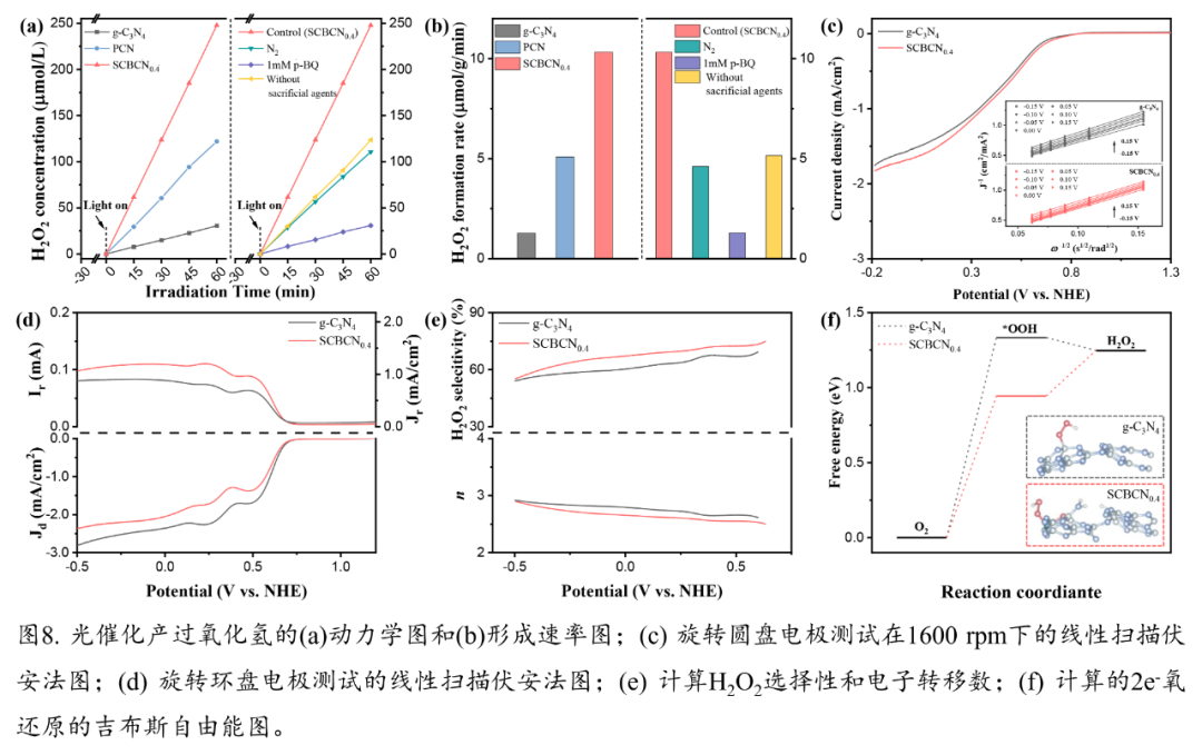 通过所制备的光催化剂进行光催化产H2O2以进一步评估其光催化性能。SCBCN0.4表现出优异的H2O2产量(247.83 μmol/L),较原始g-C3N4高约8.10倍。在氮气吹扫条件下,SCBCN0.4在1小时内产生110.63 μmol/L H2O2,表明水氧化反应也是SCBCN0.4产H2O2的重要机制。而在对苯醌(p-BQ)淬灭条件下SCBCN0.4产H2O2受到明显抑制,因此SCBCN0.4导带上的H2O2产生更多是通过间接连续两步单电子还原路径。此外,在没有牺牲剂条件下SCBCN0.4依旧表现出优异的光催化产H2O2潜力(309 μmol/L),这优于大多数改性氮化碳和无金属光催化剂。旋转圆盘电极测试的线性扫描伏安法曲线显示SCBCN0.4在1600 rpm时具有更高的限制电流密度和起始电位。极化曲线和H2O2形成电流图显示SCBCN0.4在氧还原和H2O2形成方面优于g-C3N4。且SCBCN0.4表现出更高的H2O2选择性,在施加电位范围内达到超过75%的H2O2选择性。SCBCN0.4光催化产H2O2的高活性和高选择性可能部分是由于−C≡N基团的修饰促进*OOH的形成和随后的氢化。且SCBCN0.4上丰富的含氧官能团也可以通过调节O2和中间体的吸附与结合以及活化相邻碳原子从而促进氧还原。同时,掺杂的B和O元素可以促进O2的吸附和质子化并降低能垒以提高H2O2的产量和选择性。DFT计算进一步证实了改性后*OOH的计算吸附能显著降低(从0.48 eV到0.05 eV),且中间体*OOH形成的吉布斯自由能显著降低。![]()