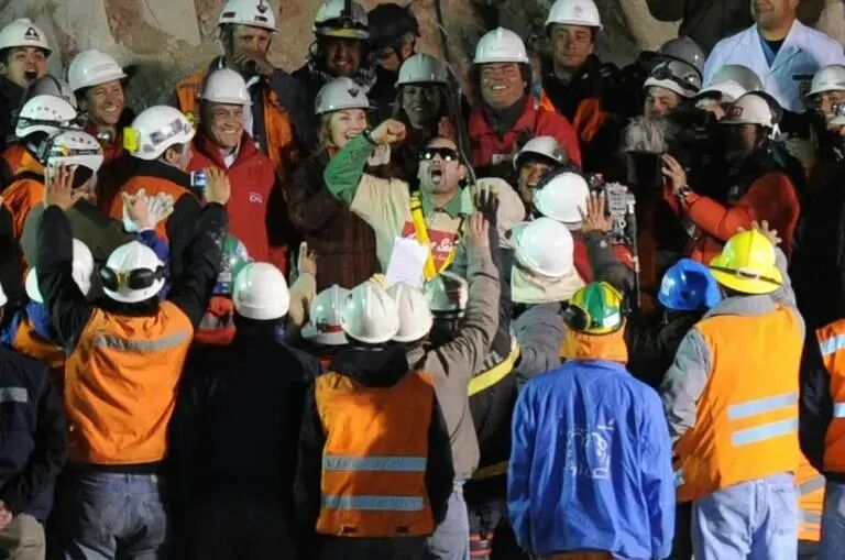 Chilean miners celebrating after being brought to the surface(智利矿工被带到地面后庆祝)