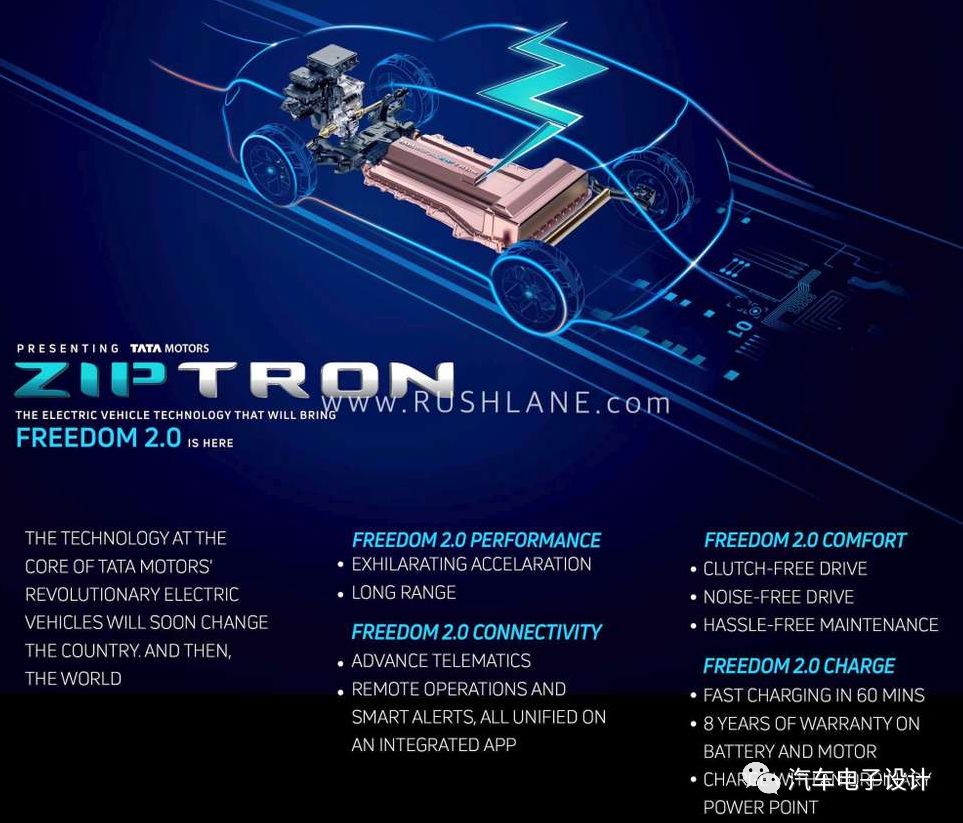 面对这个局面Tata也没有太好的办法,目前发布电动汽车技术品牌“Ziptron”,这个高压化的平台将成为塔塔未来电动车型的基础,用于2020年初推出的BEV车型(Altroz和Nexon)