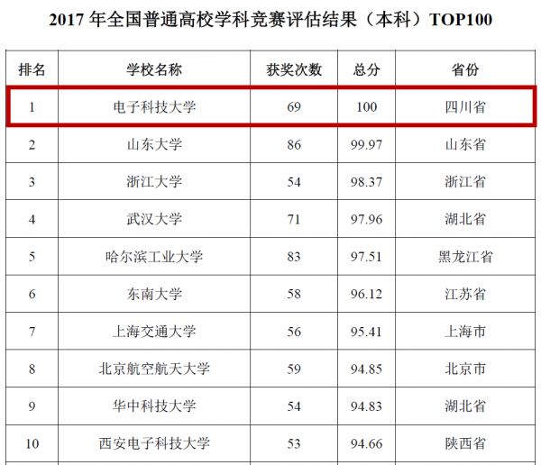 今年2月,中国高等教育学会发布“中国高校创新人才培养暨学科竞赛评估结果”,在“2017年全国普通高校学科竞赛评估结果(本科)”中,电子科技大学以69个奖项、总成绩100分,名列全国第一。
