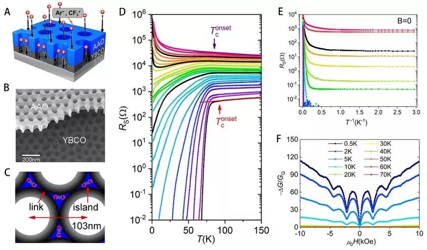 量子材料以及量子相变是本世纪凝聚态物理与材料领域的研究热点。自高温超导发现以来,二维量子金属态的存在及其形成机制是三十多年来国际学术界一直悬而未决的重要物理问题。电子科技大学张万里、熊杰研究团队与北京大学王健教授团队、林熙研究员课题组、北京师范大学刘海文研究员、清华大学姚宏教授、美国布朗大学James M. Valles Jr 教授等合作首次在高温超导纳米多孔薄膜中完全证实了量子金属态的存在。通过调节反应离子刻蚀的时间,在高温超导钇钡铜氧(YBCO)多孔薄膜中实现了超导—量子金属—绝缘体相变。通过极低温输运测试发现,超导、金属与绝缘这三个量子态都有与库珀电子对相关的h/2e周期的超导量子磁导振荡,证明量子金属态是玻色金属态,揭示出库珀对玻色子对于量子金属态的形成起到了主导作用。图A-C:纳米多孔超导薄膜示意图;图D-E:电阻温度输运曲线;图F:量子磁导振荡曲线