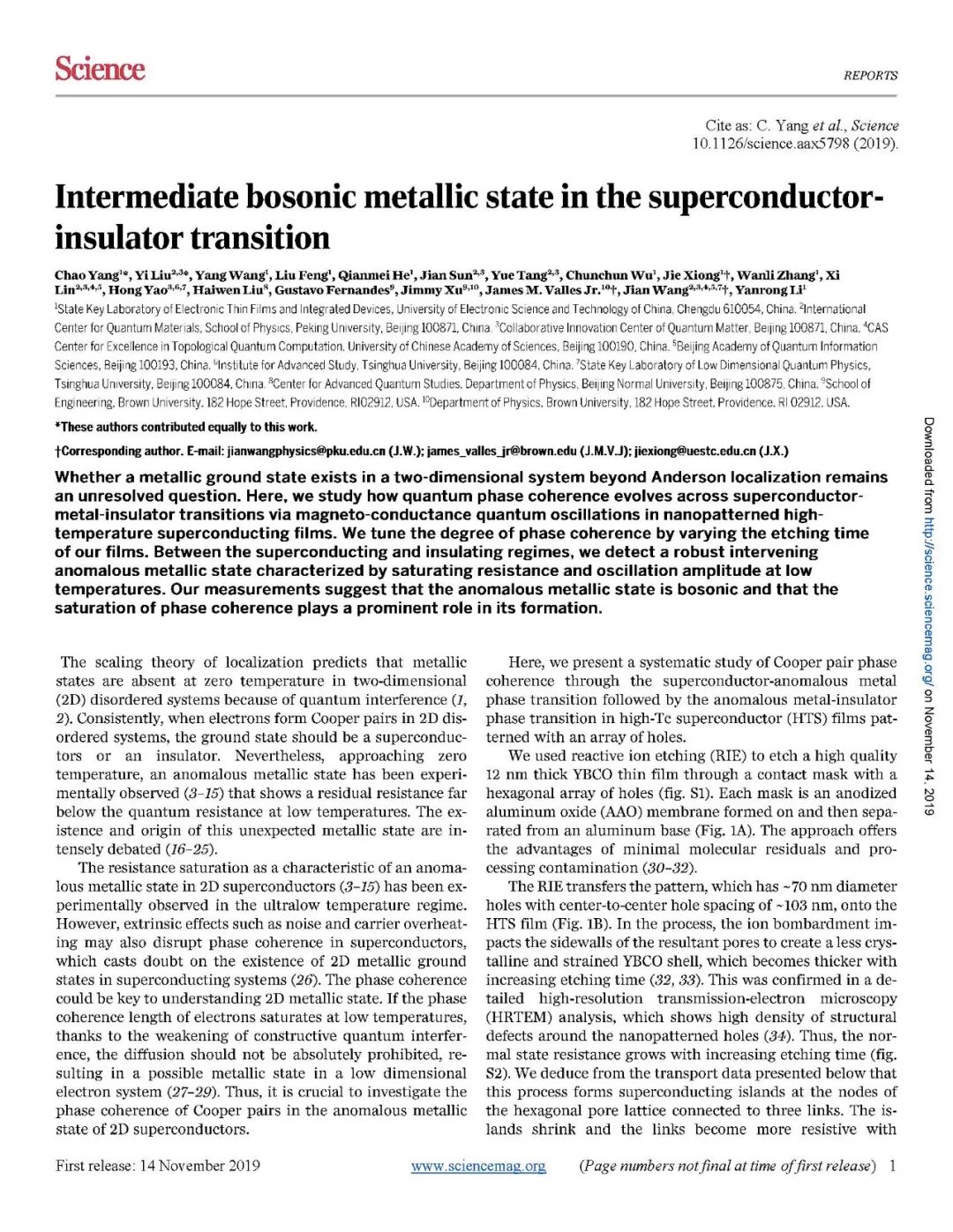 11月14日,国际著名期刊《Science》以“first release”形式刊发《超导-绝缘相变中的玻色金属态》(Intermediate bosonic metallic state in the superconductor-insulator transition),我校电子薄膜与集成器件国家重点实验室博士生杨超(导师李言荣院士)为第一作者,熊杰教授为通讯作者,张万里教授、李言荣院士为共同作者。这是我校首次以第一单位在《科学》正刊上发表研究成果,该发现是在我校国家重点实验室做出的原创成果,标志着我校在高温超导量子相变领域取得了重大研究进展。![]()
