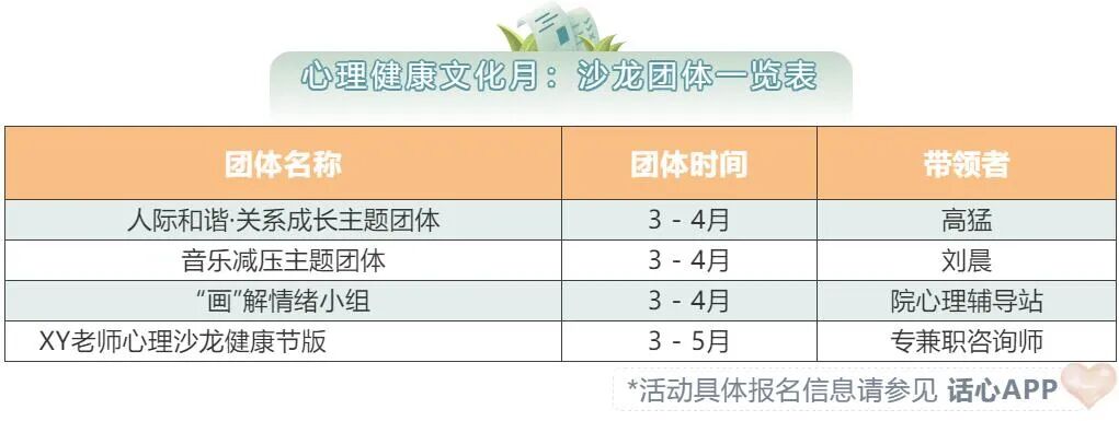 心理健康文化月,旨在通过丰富实用的心理主题活动,全面专业的心理健康服务,温暖温馨的心理朋辈支持,提高师生群体的心理健康意识,营造一个和谐、温馨、成长的校园心理健康氛围。