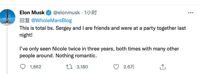 当地时间7月24日,马斯克在推特上表示:“谢尔盖和我是朋友,昨晚刚一起参加了一个聚会。三年内我只见过妮可两次,两次都是和周围的许多人在一起。一点都不浪漫。”