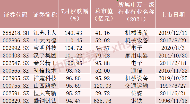 7月十大牛股分布在机械设备、电子、家用电器、通信、交通运输、传媒、钢铁行业中,其中属于机械设备行业的有江苏北人、中大力德、祥鑫科技这3只。涨幅最大的机器人概念股江苏北人为科创板股票,整个7月份累计上涨149.43%。