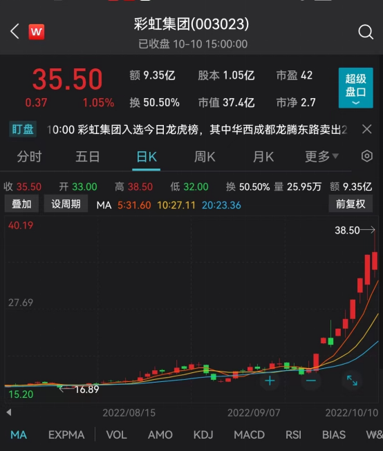 10月10日,彩虹集团早盘大幅低开,随后震荡走高,盘中再次逼近涨停,一度创下38.5元新高。但尾盘跳水,最终上涨1.05%。9月21日以来,公司股价9天6板累计上涨超8成。