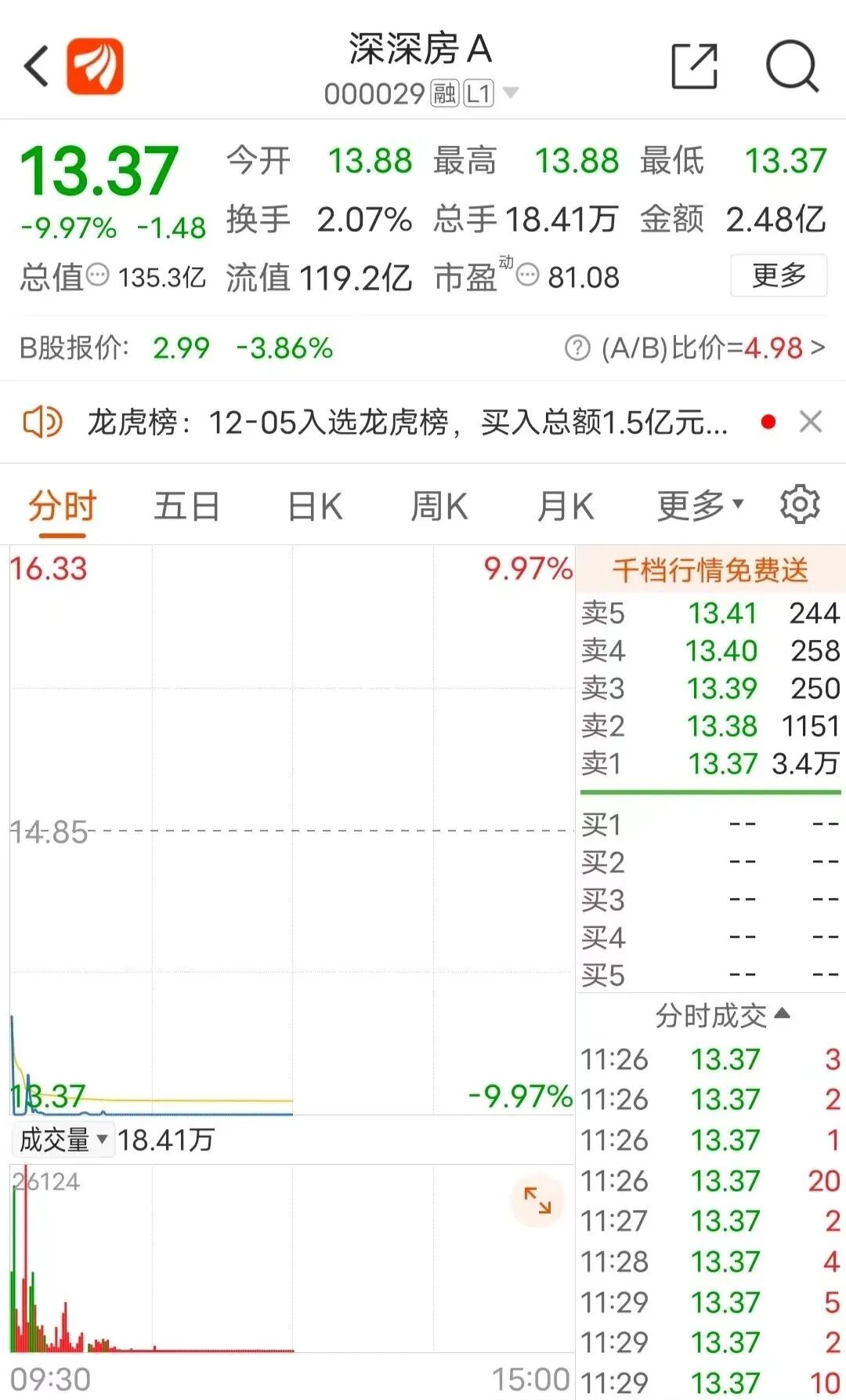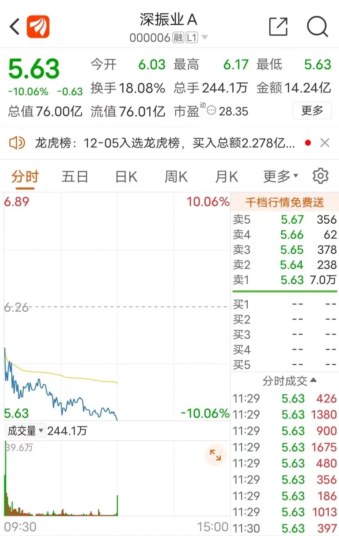 截至12月6日上午收盘,深深房A、深振业A跌停。深纺织A盘中一度跌停,深城交等多只与荣耀借壳上市传闻相关的股票大跌。
