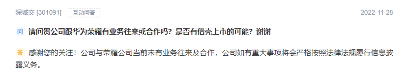 对于与荣耀是否有业务合作,荣耀是否有借壳公司上市的可能,11月28日,深城交在互动易回复投资者提问时表示,公司与荣耀公司当前未有业务往来及合作,公司如有重大事项将会严格按照法律法规履行信息披露义务。